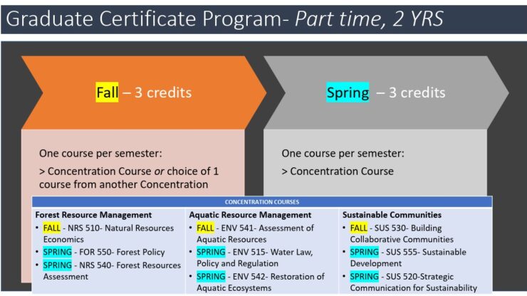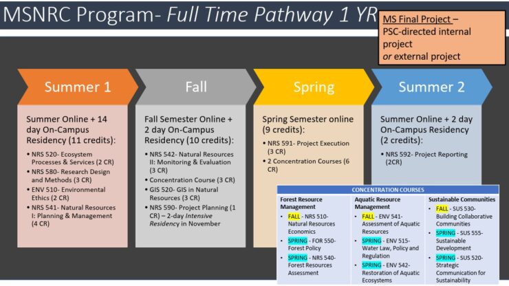 The Master’s of Natural Resources Conservation (MSNRC) offers flexible study options for graduate students balancing a variety of considerations such as career, family obligations, free-time constraints, health, resources, and external/community interests.